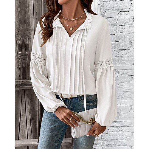 Per donna Blusa Tinta unica Vintage Tropicale Elegante Manica Lunga Girocollo Top Regolari Quotidiano Pizzo Patchwork Bianco Rosa Verde Cachi Estate Primavera Autunno Inverno