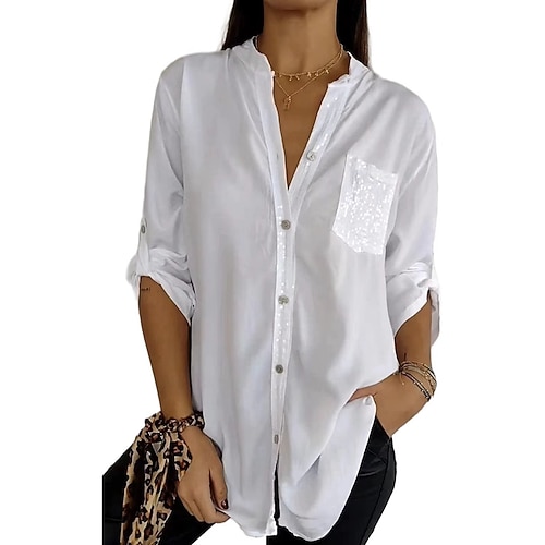 Per donna Camicia Blusa Tinta unica Essenziale Informale Manica lunga A V Top regolari Giornaliero Bottoni Nero Rosa Verde militare Cachi Autunno Inverno