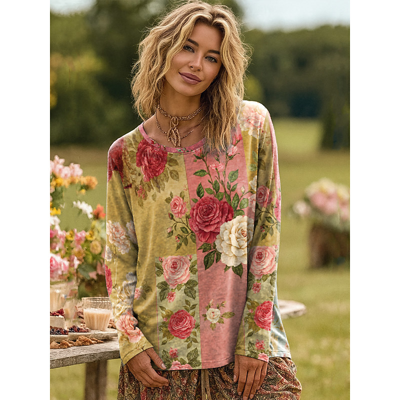 Women's 3D Print T Shirt Floral Graphic Gradient Elegant Vintage Stylish Long Sleeve Crew Neck Round Neck Regular Tops Daily Going out Weekend Yellow Red Green off-white Spring Fall Spring Fall