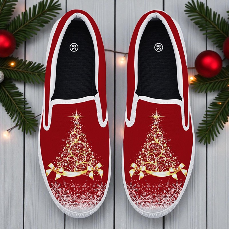 Women's Red Christmas Slip-On Shoes with Sparkling Wine Glass Printed – Stylish Holiday Footwear with Glittering Design, Perfect for Christmas Parties, Casual Outings and Gift Giving