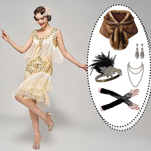 set con midi vestito da flapper fascia di piume scialle di pelliccia sintetica collana orecchini lunghi guanti da opera abiti da donna ruggenti anni '20 anni '20 ragazza flapper cocktail festa in