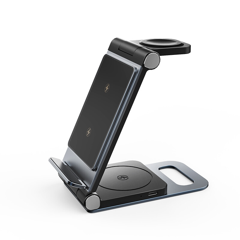 Rexsun Station de Charge Sans Fil Pliable 3-en-1, Support de Charge en Alliage d’Aluminium pour Plusieurs Appareils Apple – Format Voyage pour iPhone, Apple Watch, AirPods, Adaptateur Secteur Non Inclus, T8, Noir