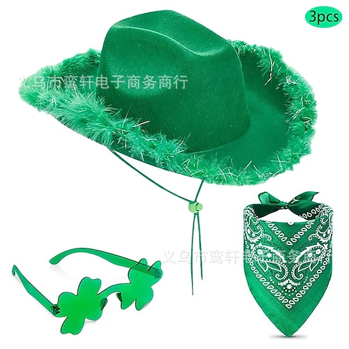 Set di 2 accessori per il giorno di San Patrizio, cappello da cowboy verde con piume, occhiali da sole a forma di cuore, bandana a forma di trifoglio, set di 3 costumi da folletto irlandese per