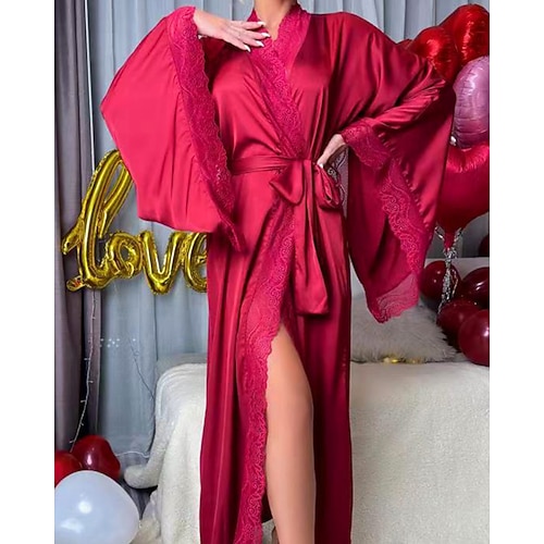 Per donna Accappatoio Casual Morbido Raso Colore Puro Pizzo Quotidiano Casa Da letto Manica Lunga Scollo a V Argento Nero Bianco Rosa Vino Estate Primavera Vestibilità comoda