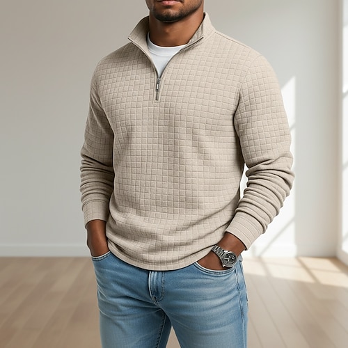 Per uomo Geometrico Plaid Nido d'ape Felpa Moda Quotidiano Classico Casual Collo alla coreana Zip a un quarto All'aperto Casa Ufficio Lavoro Blu Marrone Verde Grigio Con zip Autunno Inverno
