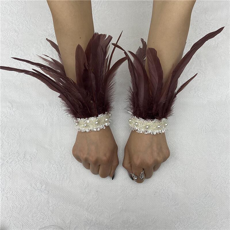 Carnival 2026Rio Carnival Samba Accessories Women's Green Feather Wrist Cuffs with White Pearl Lace Brazil Festival Performance Costume