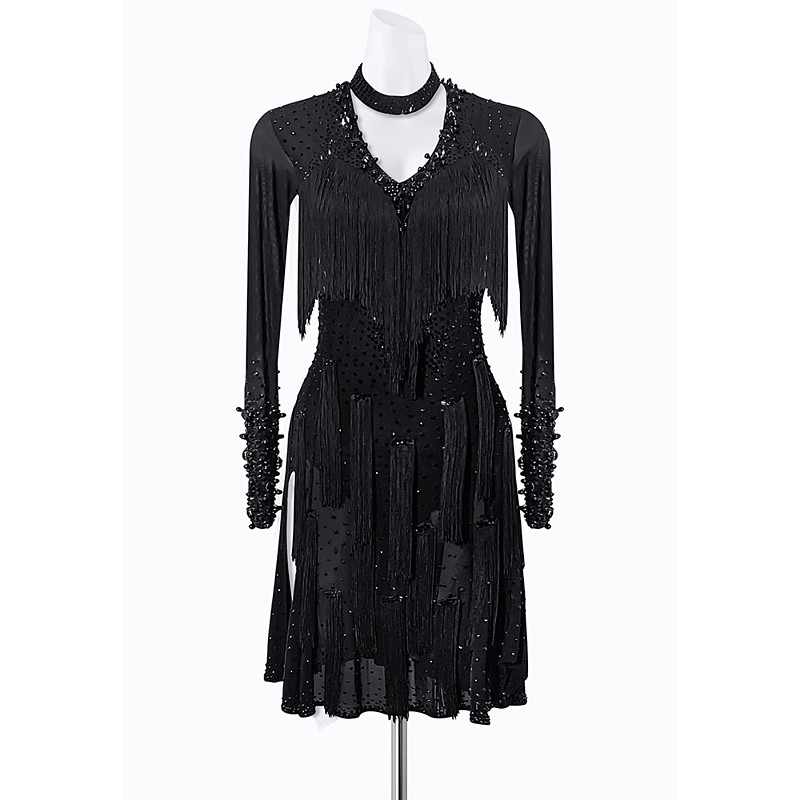 Women's Black Beaded Fringe Latin Dance Dress - Long Sleeve Choker Neck Asymmetrical Ballroom Performance Costume