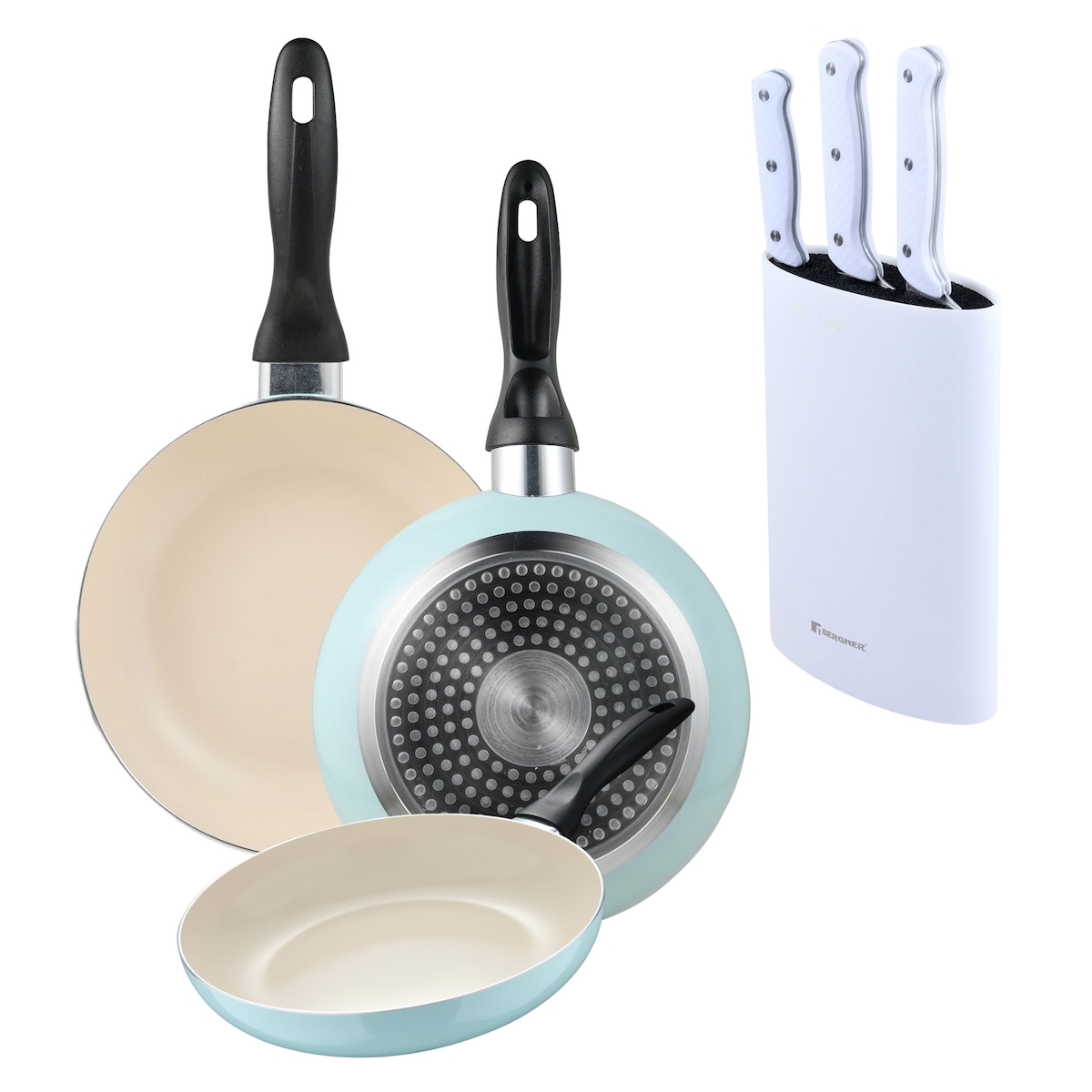 BERGNER - Set aus 3 Pfannen Ø16/Ø20/Ø24 cm gepresstes Aluminium Himmelblau 3-teiliges Messer-Set mit Messerblock aus Edelstahl