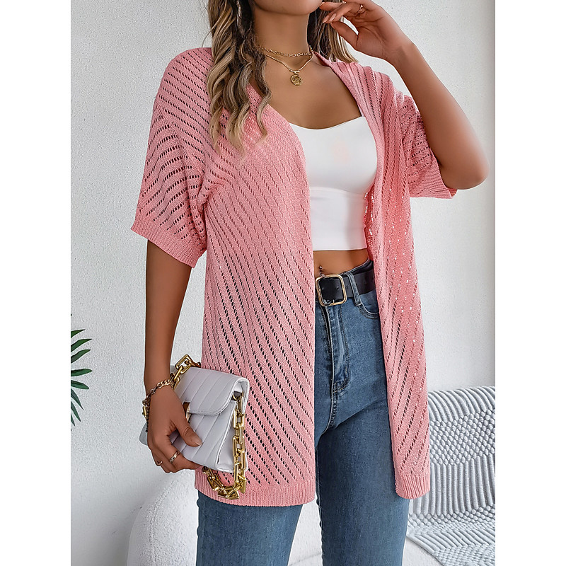 Women's Cardigan Cable Knit Sweater Streetwear Daily Stylish Pure Color Cable Crochet Open Front Mesh Knitted Drop Shoulder Short Sleeves Long Tops Knit Home Party Daily White Pink Summer Spring