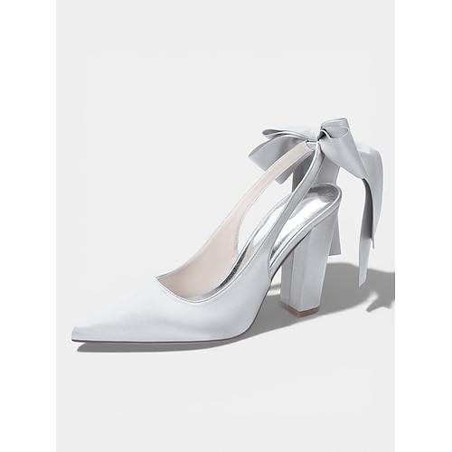scarpe da sposa eleganti in raso con tacco a spillo, punta a punta, cinturino posteriore con fiocco, per la sposa che si sposa in chiesa