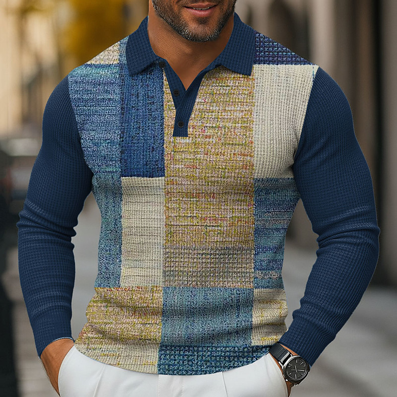 Men's Color Block Waffle Polo Shirts Long Sleeve Polo Shirts Collared Shirts Business Casual Business Wear to work Daily Wear 3D Print Buttons Spring Fall Winter Blue Blue 1 Blue 3#