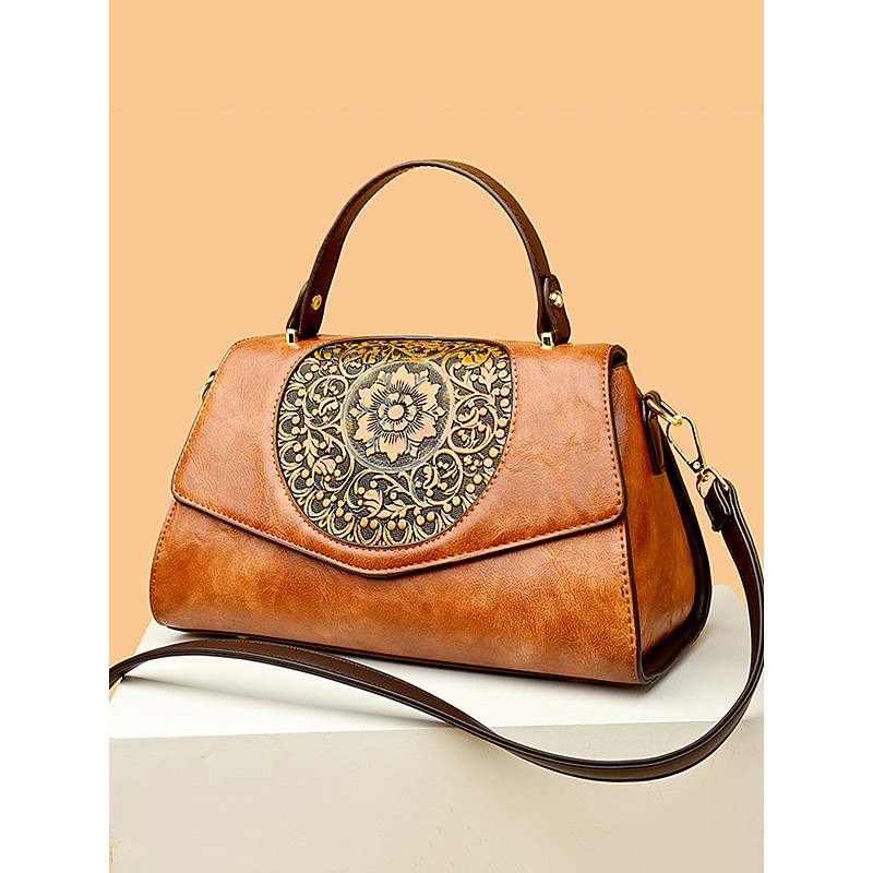 Vintage Floral Engraved Faux Leather Handbag – Women's Retro Crossbody Bag with Top Handle for Casual and Formal Occasions Wine Black White