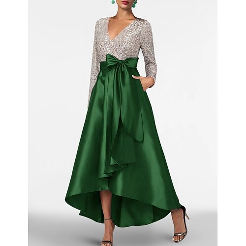 Linea ad A Asimmetrico Abiti da Cocktail Abito da Sera Da principessa Abito formale Elegante Setoso Manica Lunga Scollo a V Matrimonio Formale Tasca Raso Con Paillettes con Fiocco/Fiocchi