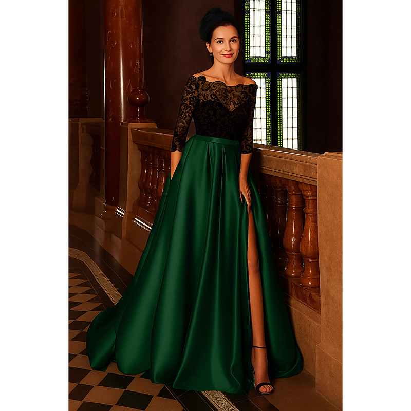 A-Line Sweep Brush Train Evening Gown Ball Gown Formal Dress Elegant Silky 3/4 Length Sleeve Off Shoulder Wedding Formal Pocket Satin Lace with Pleats Slit