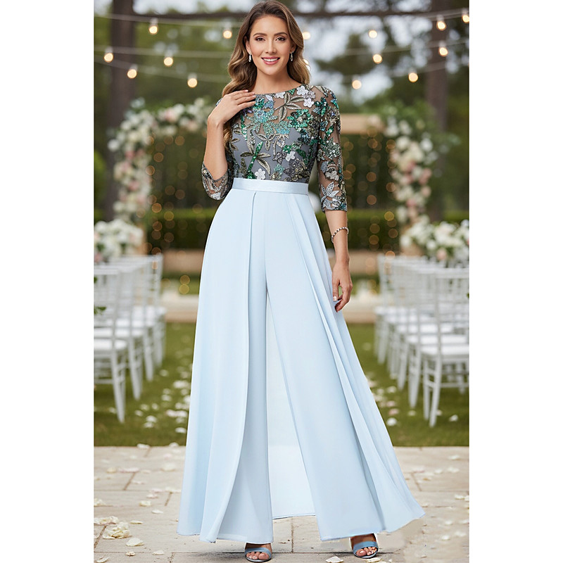 Jumpsuits A-Line Floor Length Beaded Eembroidered Formal Dresses Mother of the Bride Dress Mother of the Bride Dress 3/4 Length Sleeve Illusion Neck Elegant Vintage Wedding Guest Church Chiffon Lace