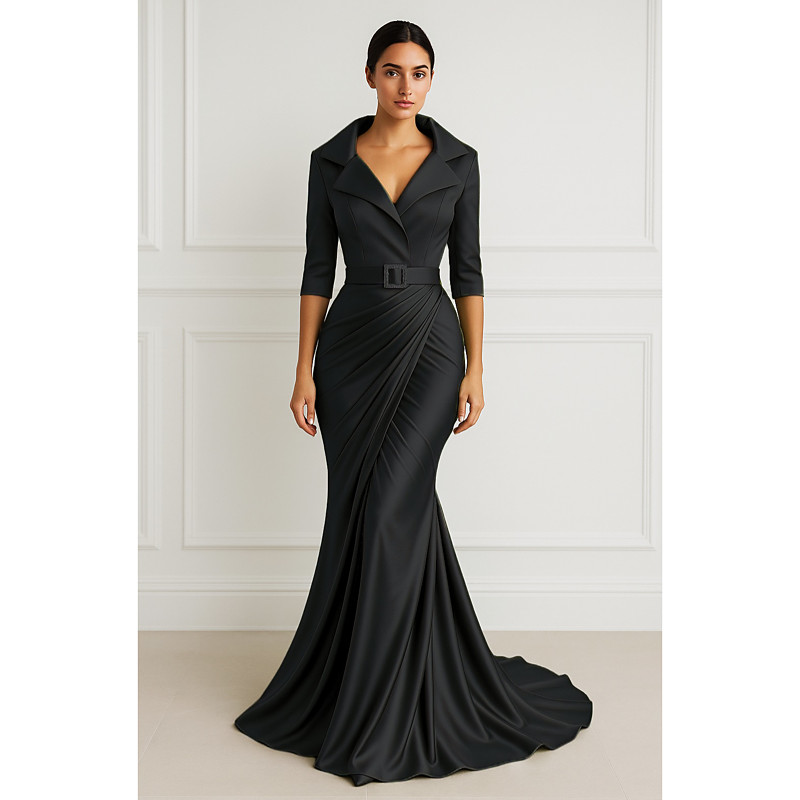 Mermaid Trumpet Floor Length Prom Dresses Evening Gown Ball Gown Formal Dress Elegant Half Sleeve Lapel Wedding Formal Belt / Sash Stretch Satin with Pleats