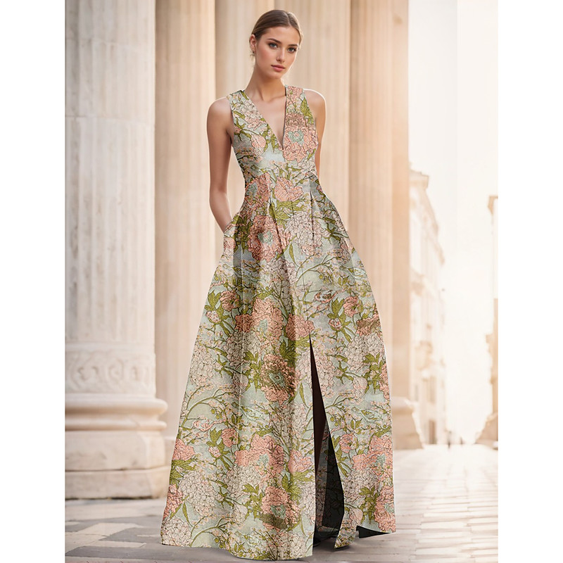 A-Line Floor Length Evening Gown Ball Gown Formal Dress Elegant Vintage Sleeveless V Neck Wedding Formal Nylon with Slit Pocket