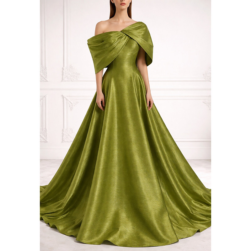 A-Line Floor Length Evening Gown Ball Gown Elegant Glittering Short Sleeve One Shoulder Wedding Formal Pocket Taffeta with Pleats Pocket