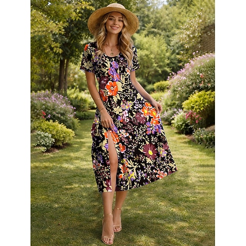 Per donna Abito Midi Vestito T-Shirt Abito a trapezio Abito Estivo Vacanza Casual Spiaggia Vestibilità comoda Floreale Grafico Manica Corta Girocollo Nero Viola Arancione Verde Estate Primavera