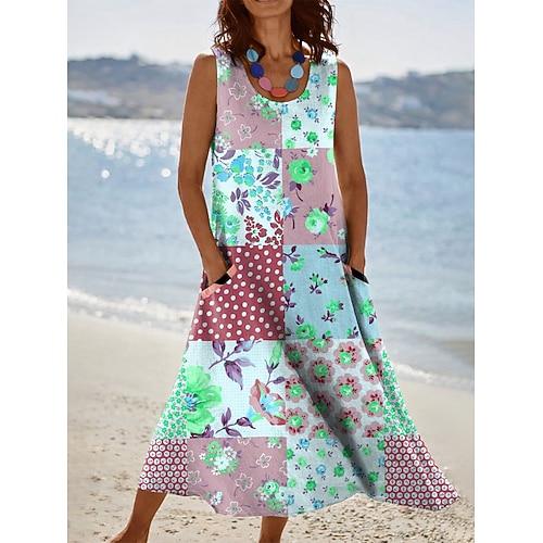 Per donna Abito Midi Vestito Estivo Abito a trapezio Vacanza Casual Boho Ferie Vestibilità comoda Floreale Grafico Senza Maniche Collo a U Blu Giallo Rosa Verde Estate Primavera