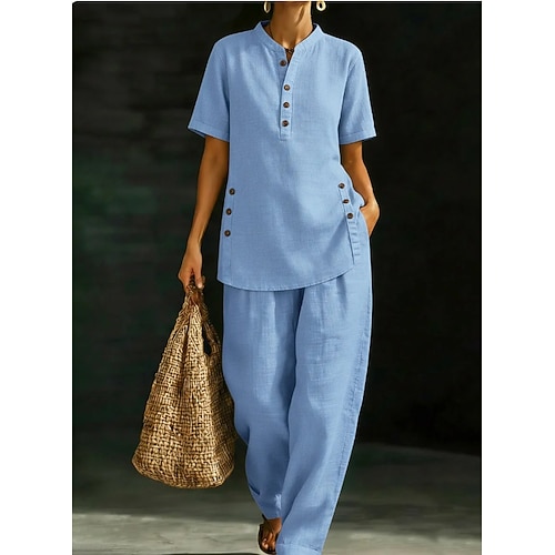 Per donna Set di biancheria in cotone Set di Pantaloni Manica Corta Dolcevita Tinta unica Elegante Moda Streetwear Casuale Quotidiano All'aperto Blu Vino Cachi Primavera Estate Vestibilità comoda