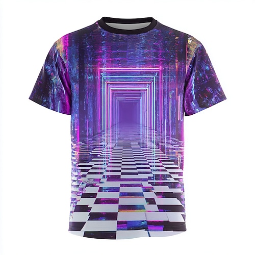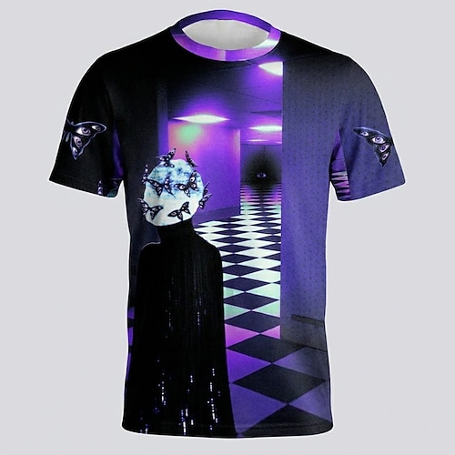T-shirt da uomo viola luminosa con motivo a scacchi sul pavimento, con silhouette di farfalla, dreamcore, weirdcore, spazio liminale, estetica surreale, abbigliamento casual streetwear, rave,