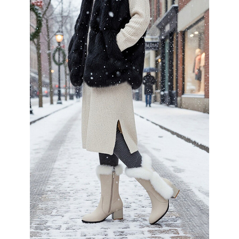 Women's White Faux Fur Lined Platform Snow Boots – Chunky Heels, Warm Stylish for Winter, Ideal for Christmas and Outdoor Fun