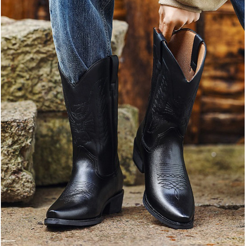 Men's Black and Burgundy Faux Leather Cowboy Boots with Embroidered Design - Classic Western Boots for Rodeo and Outdoor Wear