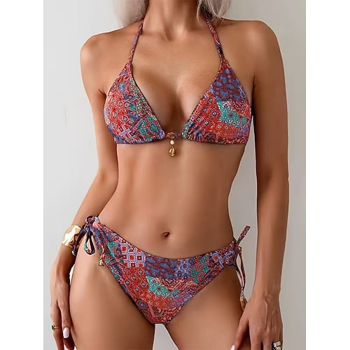Costume da bagno a bikini da donna 2 pezzi boho con legacci slim schiena scoperta per vacanze al mare stampa floreale color block collo all'americana senza maniche costumi da bagno