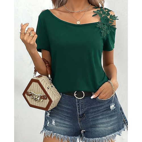 Per donna Maglietta Tinta unica Vintage Elegante Casual Manica Corta Collo asimmetrico Top Regolari Quotidiano Uscire Weekend Patchwork Nero Bianco Marrone chiaro Verde Estate Primavera Autunno
