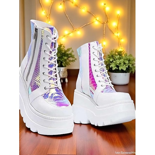 Stivali da combattimento con plateau rosa da donna, stivaletti alla caviglia con lacci olografici e tacco grosso con cerniera laterale, stile street audace per outfit da sera e da festa