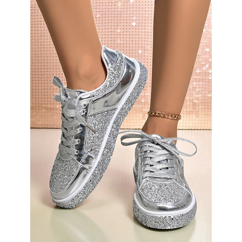 Women's Gold Glitter Sneakers - Shiny Lace-Up Casual Shoes with Sparkly Design for Nightlife, Clubbing and Party Outfits