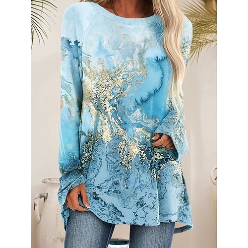 Damen T Shirt Grafik Geometrie Vintage Stilvoll Lässig Langarm Rundhalsausschnitt Lange Oberteile Täglich Druck Blau Purpur Grün Herbst Winter