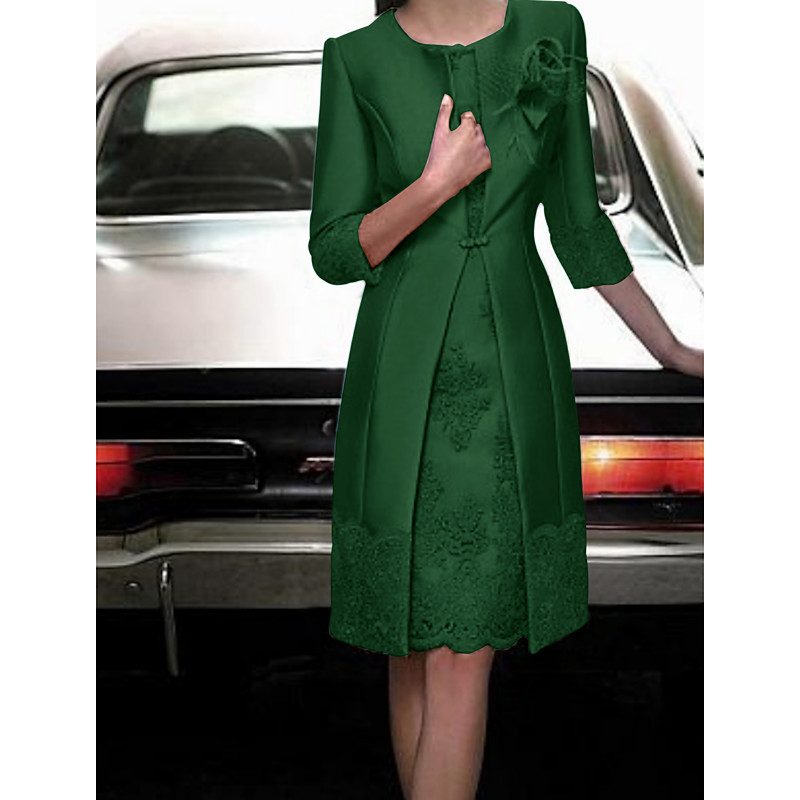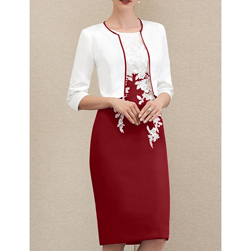 Sheath Column Knee Length Wedding Guest Dress Mother of the Bride Dress 3/4 Length Sleeve Jewel Neck Vintage Plus Size Wedding Guest Satin Lace Jacket Dresses with Appliques