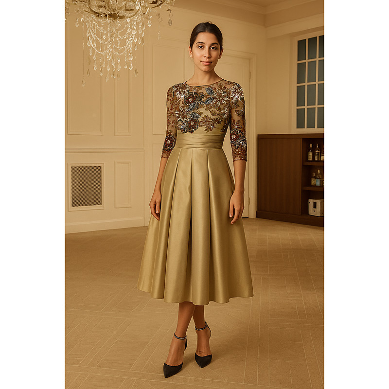 A-Line Tea Length Beaded Eembroidered Formal Dresses Mother of the Bride Dress Cocktail Dresses Party Dresses Elegant 3/4 Length Sleeve Crew Neck Garden Party Wedding Satin Lace with Pleats Beading