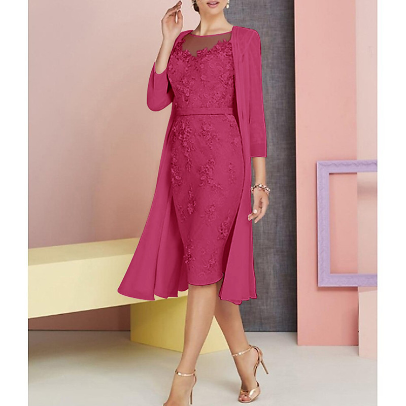Two Piece Sheath Column Dress Sets Knee Length Wedding Guest Dress Mother of the Bride Dress 3/4 Length Sleeve Jewel Neck Elegant Wedding Guest Church Chiffon Satin Lace Jacket Dresses with Appliques