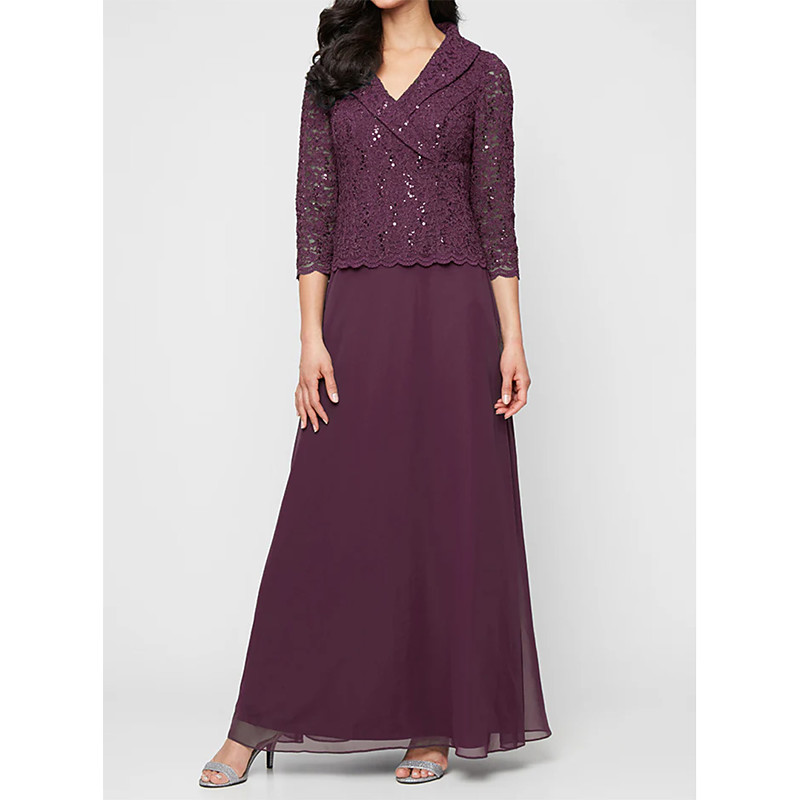 A-Line Floor Length Party Dress Cocktail Dress Wedding Guest Dress Mother of the Bride Dress 3/4 Length Sleeve V Neck Elegant Simple Minimalist Formal Wedding Guest Chiffon Lace with Lace Sequin