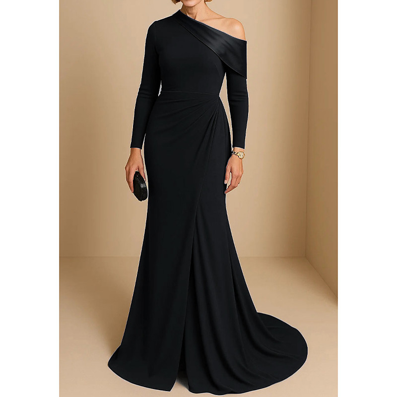 A-Line Sheath Column Sweep Brush Train Prom Dresses Evening Gown Ball Gown Formal Dress Elegant Glittering Celebrity Style Long Sleeve One Shoulder Garden Party Wedding Satin Stretch Satin with Ruched