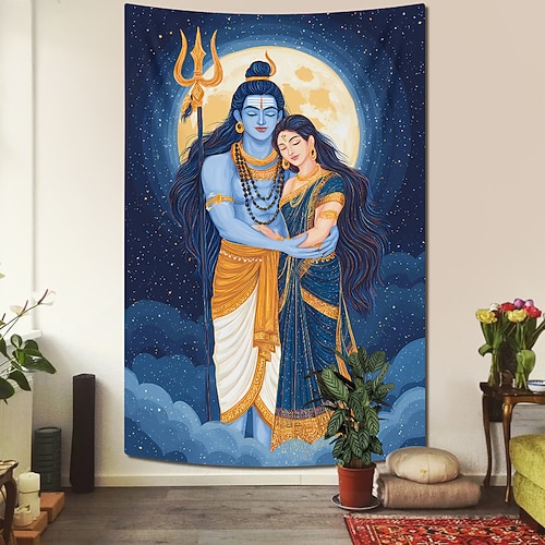 Arazzo da parete con l'immagine di Shiva e Parvati, amore divino, raffigurante il dio indù Shiva e la dea Parvati, con luna piena e cielo stellato, ideale per studio di yoga, sala meditazione, camera