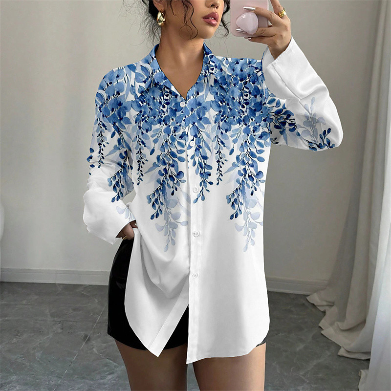 Women's Shirt Flower Daily Stylish Casual Long Sleeve Shirt Collar Regular Tops Work Daily Holiday Buttons Blue Spring Fall