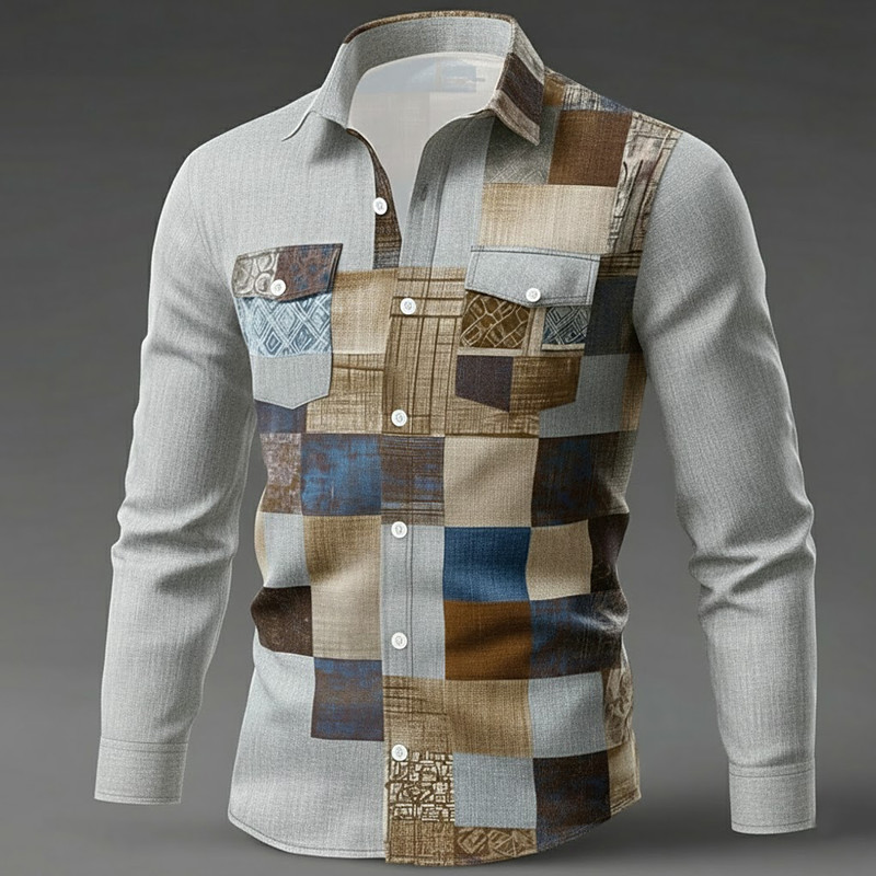 Men's Geometric Color Block Patchwork Shirt Button Up Shirt Long Sleeve Fashion Casual Outdoor Dailywear Spring Fall Turndown Front Two Pockets Linen Like Shirt Blue Brown Green Gray