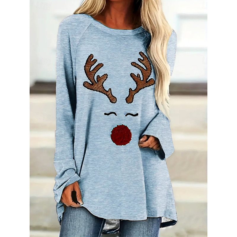 Women's T shirt Long Sleeve Tunic Top Reindeer Print Long Sleeve Round Neck Beige Casual Holiday Festive Apparel Plus Size Comfort Fit Prefall