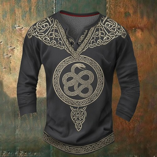Herren Schlange Wikinger Henley Hemd T-Shirt Langarm Vintage Mode Vikinger Lässig Ferien Ausgehen Herbst Frühling Herbst Dunkelgrau Marineblau Henley Henley T-Shirt