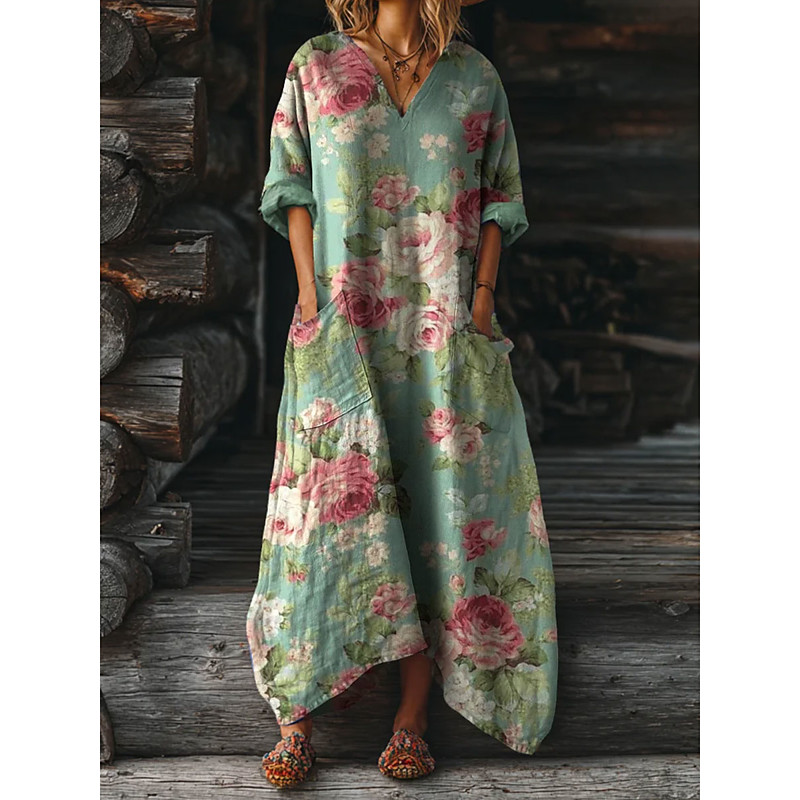 Women's Midi Dress Sundress A Line Dress Vacation Casual Boho Going out Beach Loose Fit Graphic Geometric Long Sleeve V Neck Pink Blue Purple Green Spring Fall Winter Autumn