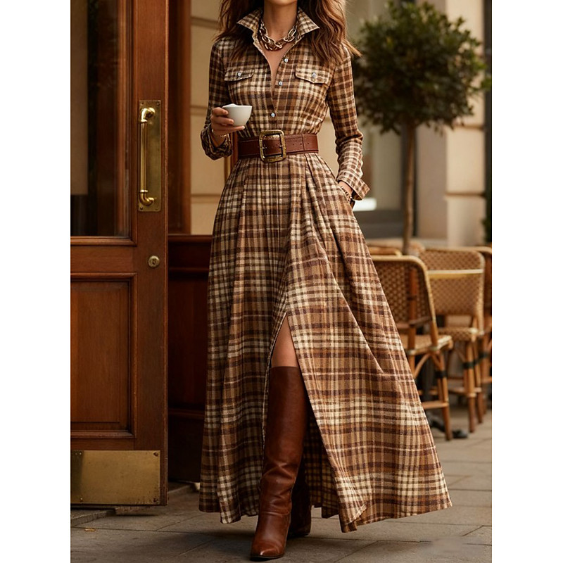 Women's Maxi Dress Shift Dress Vacation Casual Boho Daily Regular Fit Plaid Long Sleeve Shirt Collar Blue Red Orange Green Spring Fall Winter