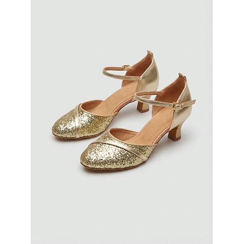 Scarpe da ballo da sala da donna con tacco alto e cinturino alla caviglia, con punta chiusa e glitter dorati, ideali per valzer, foxtrot e tango. prestazione
