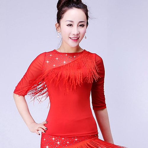 Top da ballo latino per ballo da sala, con nappe, frange e strass, con ruches, allenamento per prestazioni da donna, mezza manica, alta, in poliestere