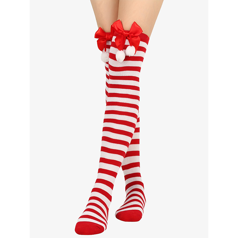 Christmas Knee-High Socks with Bow and Pom-Pom Decor – Festive Striped and Solid Colors for Women and Girls