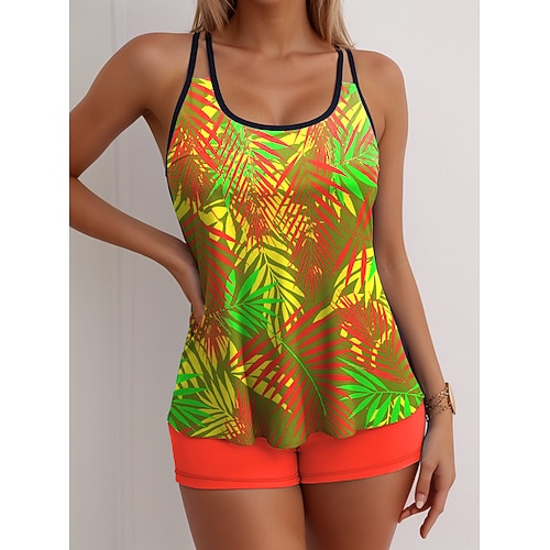 Costume da bagno tankini da donna 2 pezzi palma vita alta senza schienale vacanza spiaggia abbigliamento grafico geometrico scollo a barchetta senza maniche