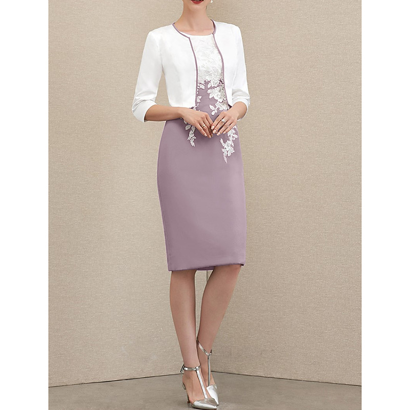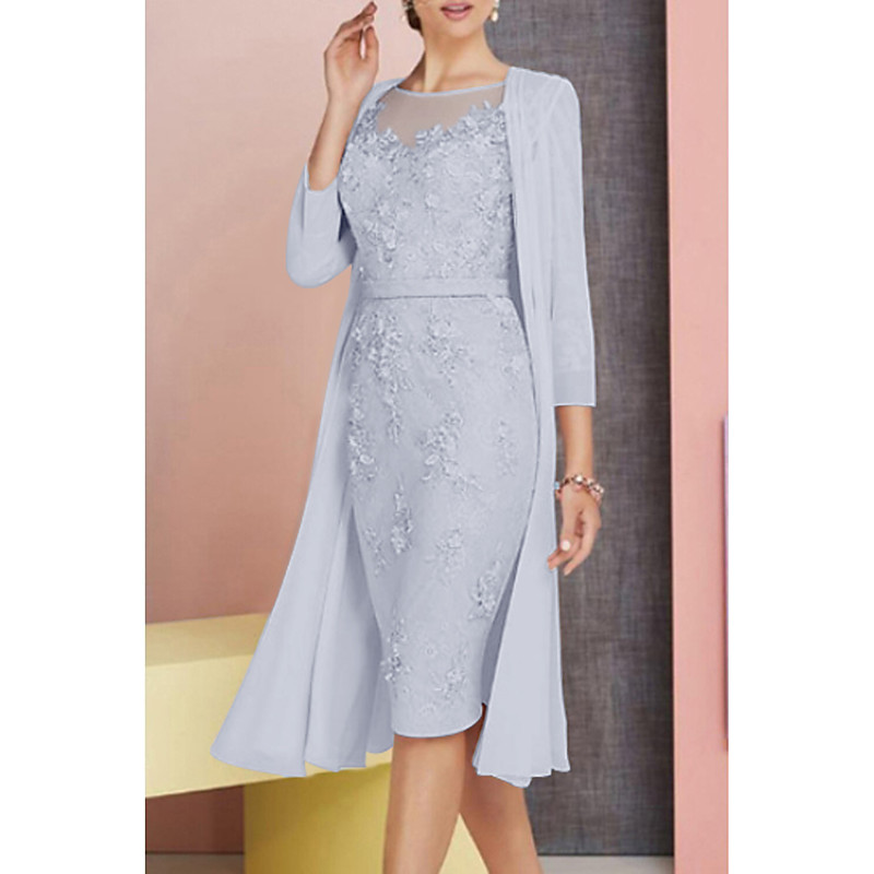 Two Piece Sheath Column Dress Sets Knee Length Wedding Guest Dress Mother of the Bride Dress 3/4 Length Sleeve Jewel Neck Elegant Wedding Guest Church Chiffon Satin Lace Jacket Dresses with Appliques